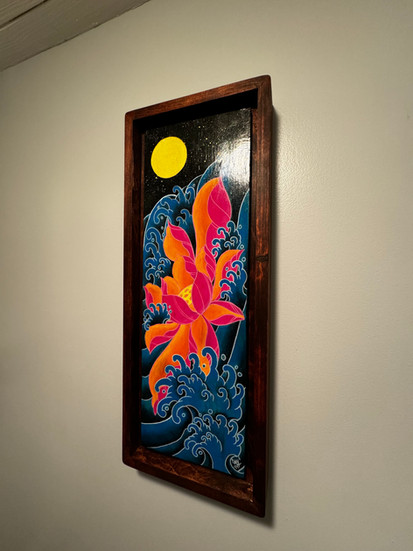 The warm vibrant colors of the lotus in contrast with the cool blue waves show the contrast in our inner expressions of self and the environments/influences the cause us to suppress those expressions.
